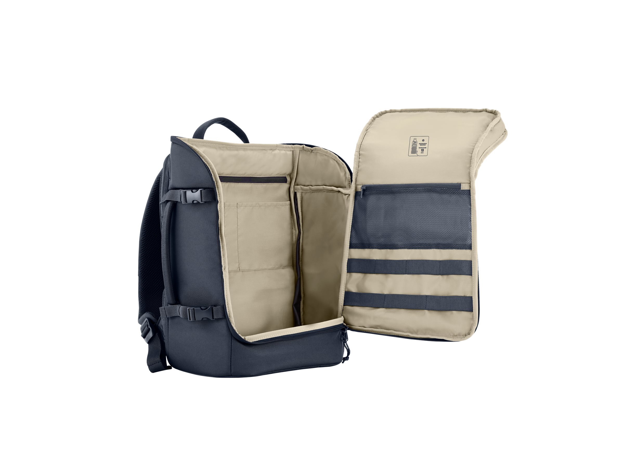 Das Reisen um die Welt war mit diesem Rucksack, der 100 % recycelten Kunststoff im Außenmaterial enthält, noch nie so leicht. Jetzt können Sie beruhigt auf Reisen gehen, da Sie wissen, dass irgendwo 13 Kunststoffflaschen weniger herumliegen.
