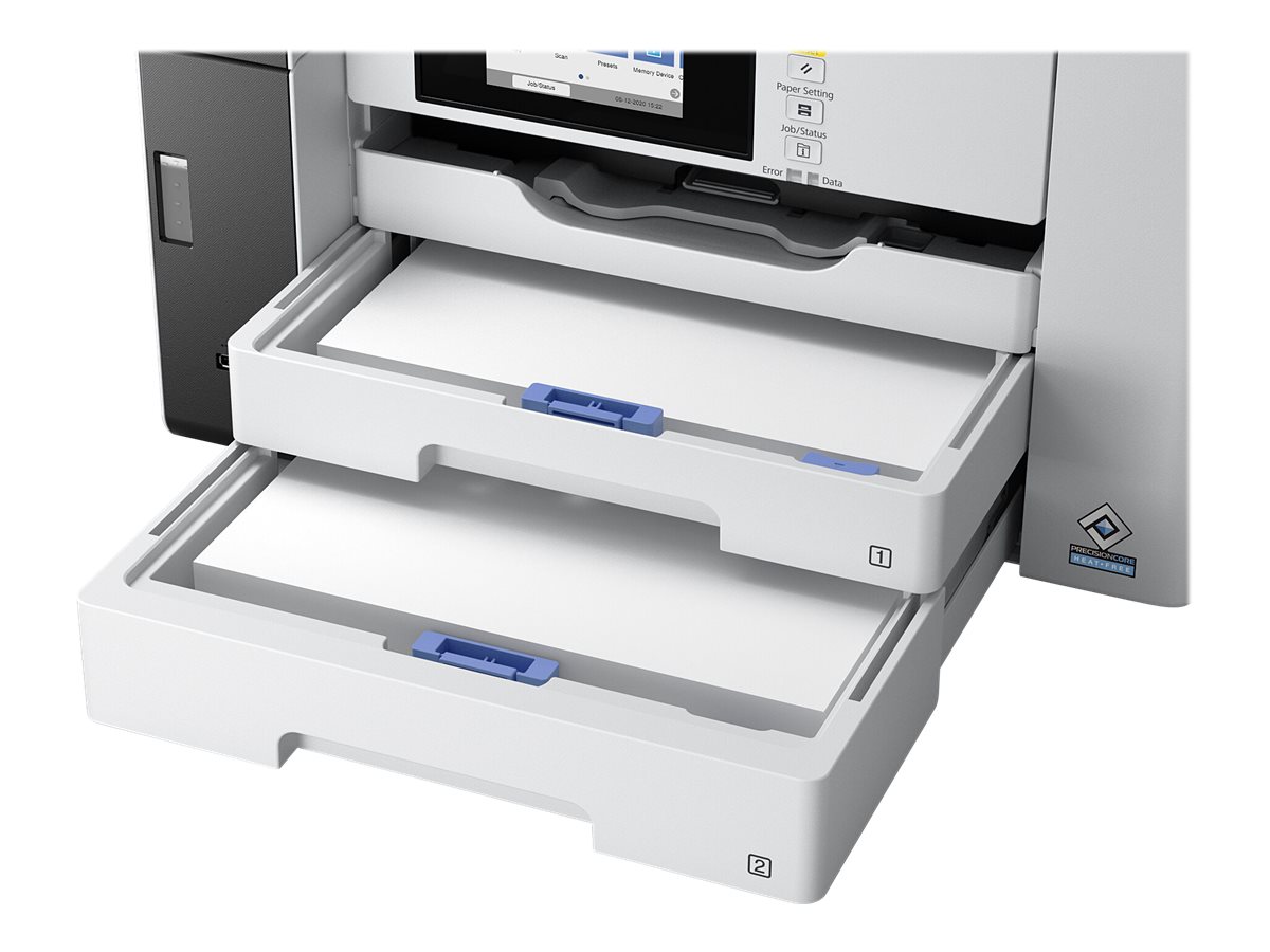 Mit einer Tintenfüllung kann dieser EcoTank Pro-Drucker viele Tausend Seiten drucken, sodass Sie seltener Tinte nachfüllen müssen. Zwei vordere Papierkassetten bieten Platz für bis zu 500 Blätter. In den hinteren Papiereinzug können Sie zusätzlich bis zu 50 Blatt einlegen. Zudem bietet der automatische Dokumenteneinzug (ADF) eine Input-Kapazität von 50 Blatt.
