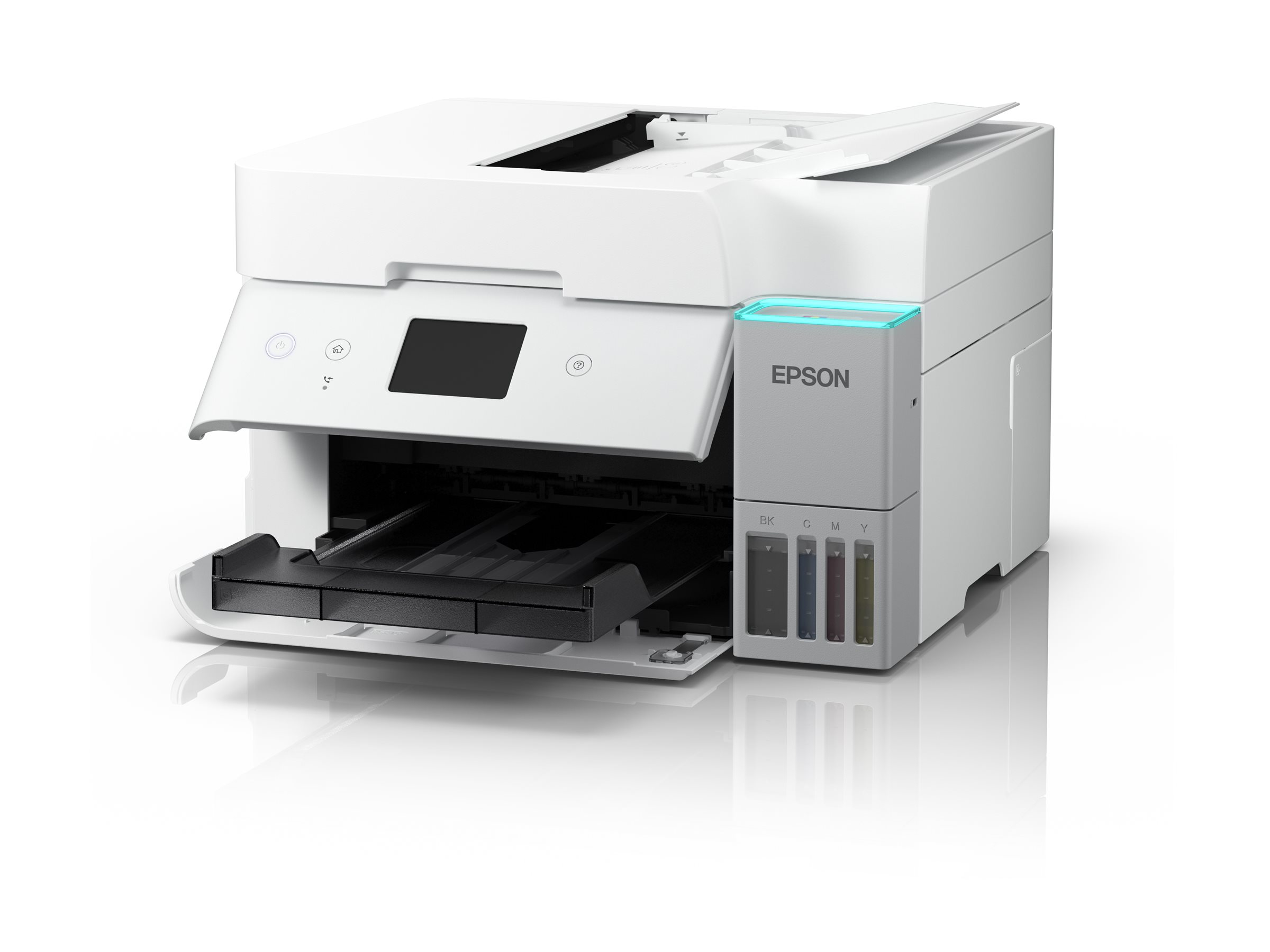 EcoTank ermöglicht komfortables Drucken zu Hause und im Büro. Die großvolumigen Tintentanks ermöglichen ein unkompliziertes Nachfüllen. Da die Tintenflaschen über ein Schlüssel-Schloss-Prinzip funktionieren, kann nur die jeweils richtige Tinte eingefüllt werden. Dank der Tintenstandsanzeige auf der Vorderseite können Sie leicht erkennen, wann ein Nachfüllen fällig ist, und dank der eleganten blauen Leuchte auf der Abdeckung des Tintentanks können Sie den Status Ihres Druckers auf einen Blick erkennen. - Weiter sparen
